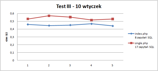 Porównałem prędkość przetwarzania dla różnych przypadków: WordPress 3.x, 2.x, dołączenie popularnych wtyczek, szablon standardowy oraz mój + dodatkowe modyfikacje.